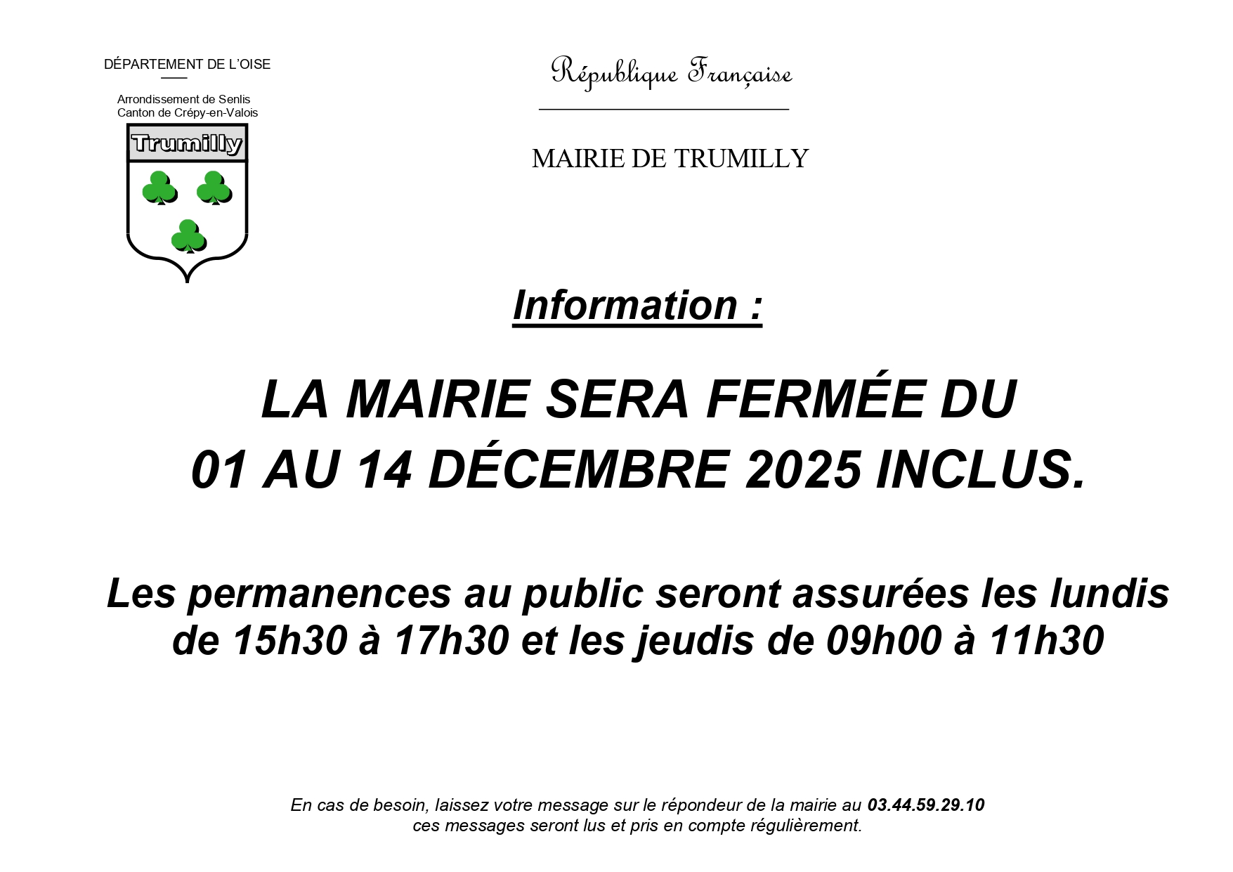 INFORMATION FERMETURE DE LA MAIRIE